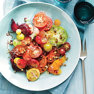 Preheat oven to 400 degrees. Wrap beets in a foil packet, sealing tightly. Roast on a rimmed baking sheet until tender, about 75 Minutes. When cool, rub beets with a paper towel to remove skins; slice. Slice large tomatoes, and halve cherry tomatoes, then arrange with beets on a platter. Top with feta, basil, and olive oil; season with salt and pepper.
