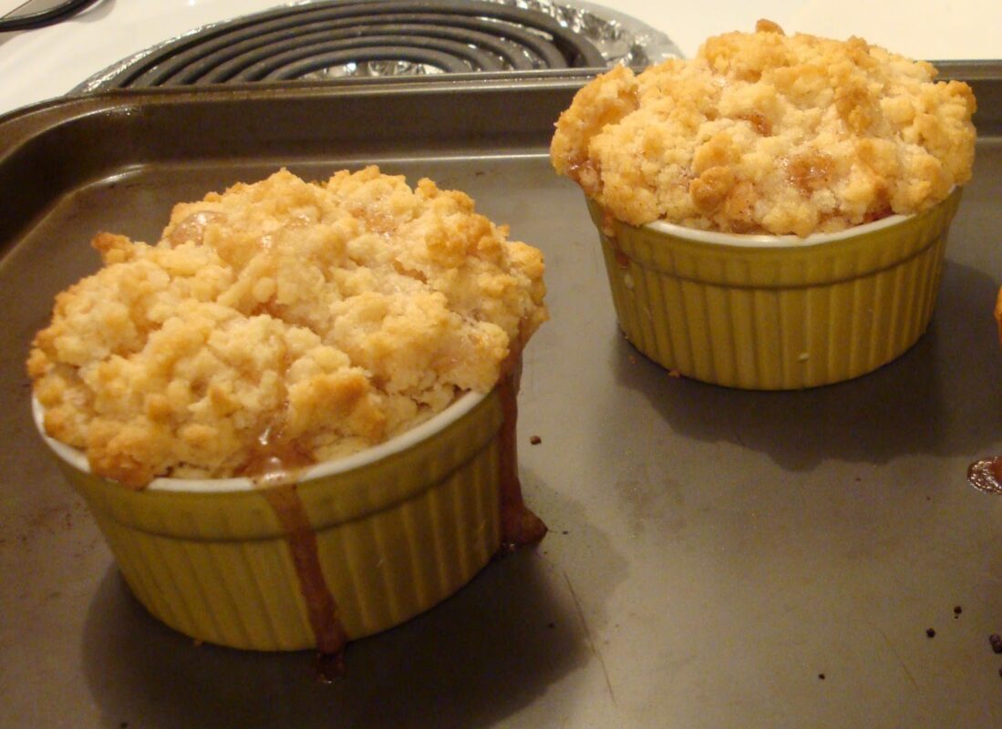 Fill ramekins with 5 alternating layers of apples and crumbs, starting and ending with breadcrumbs. Press down on the layers as you fill the ramekin.
