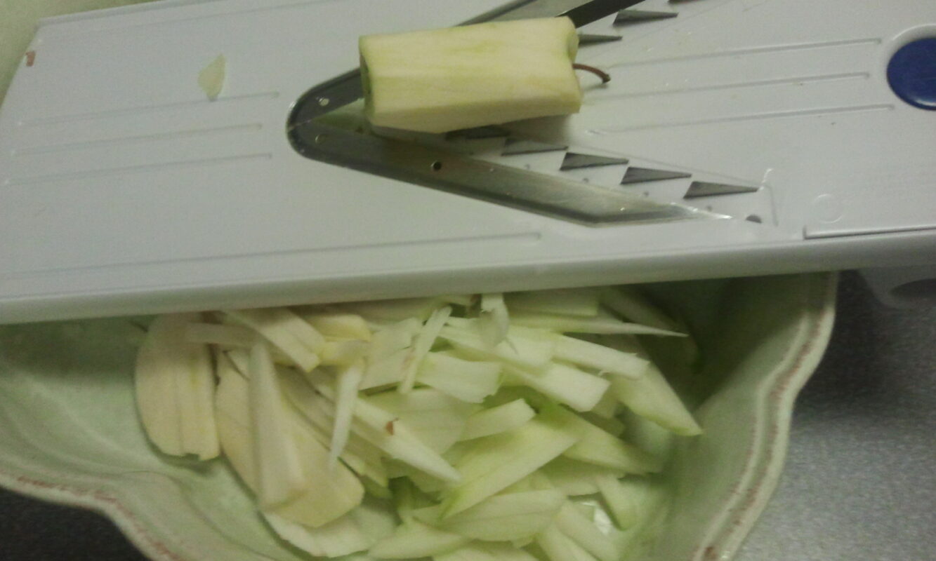 Peel and slice apples thinly. Obviously I’ve got a great peeler from The Peppermill and my handy mandoline!
