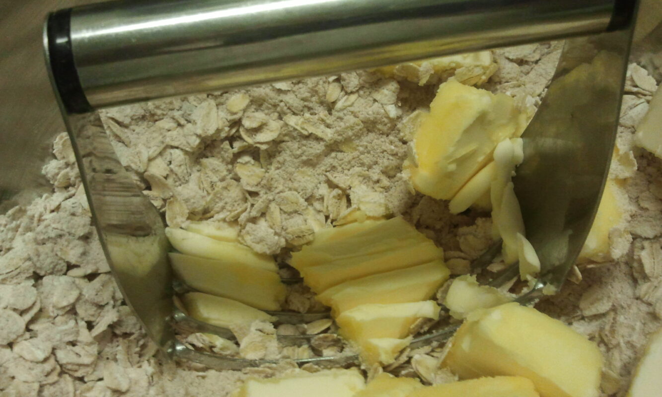 Cut up the margarine and work it into the dry ingredients using a pastry blender or your fingertips.
