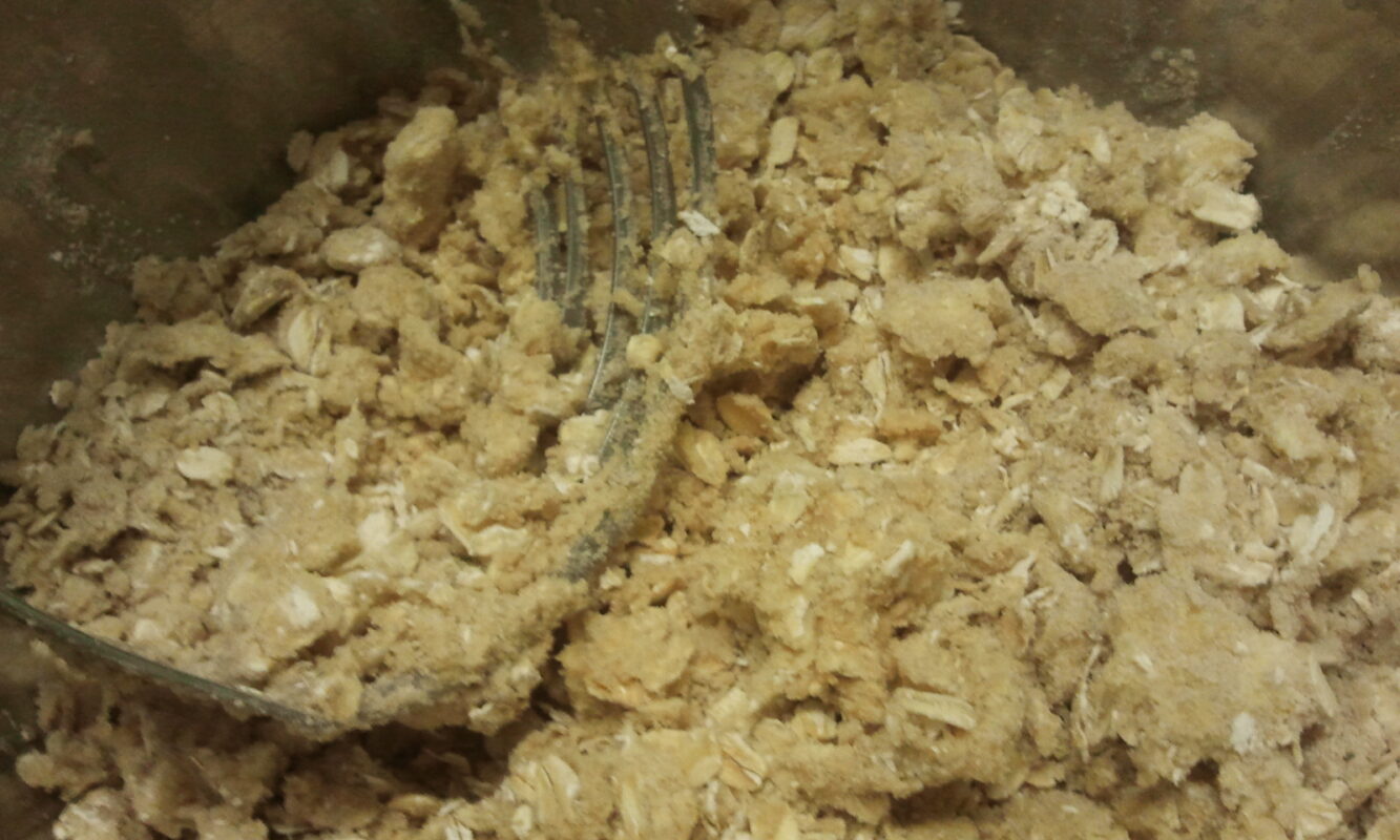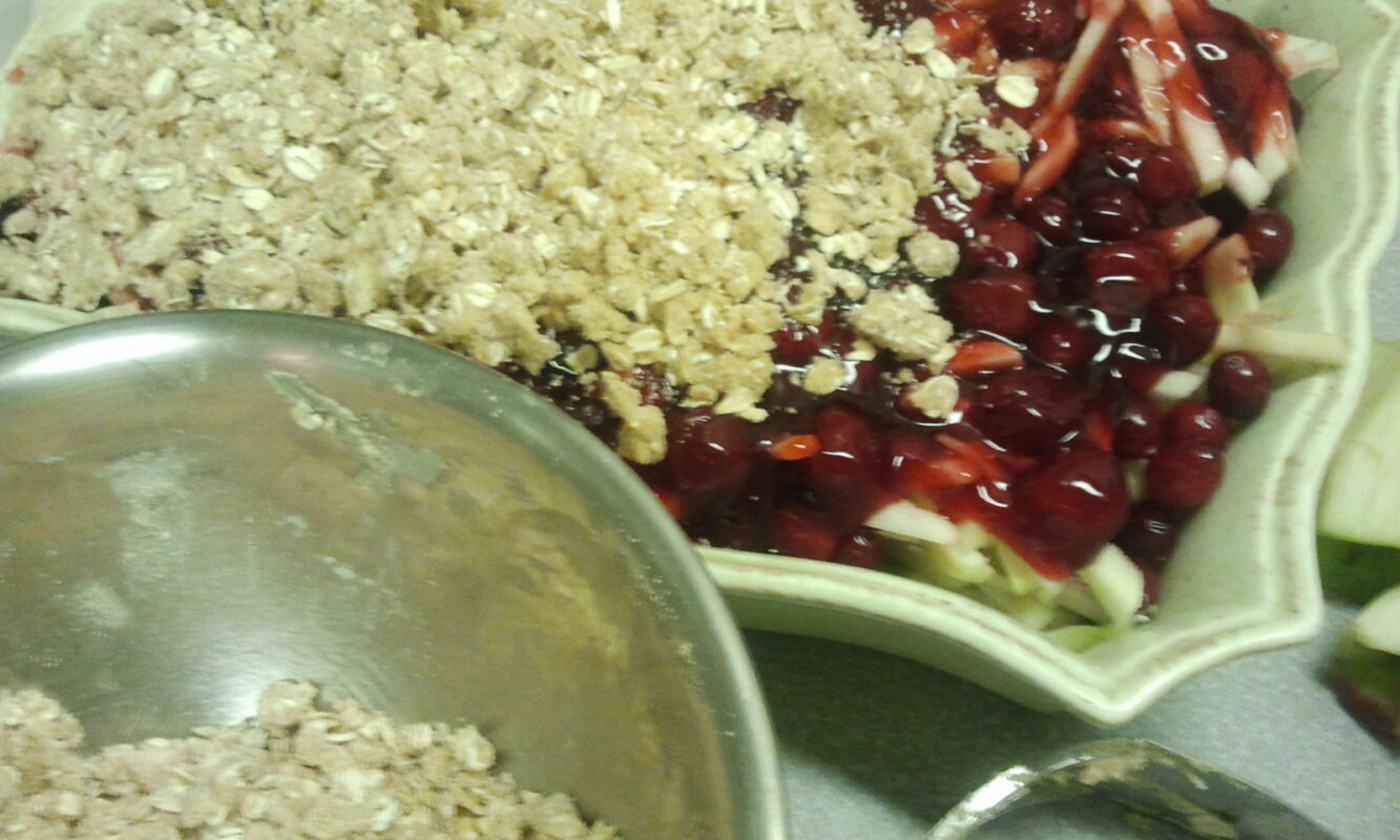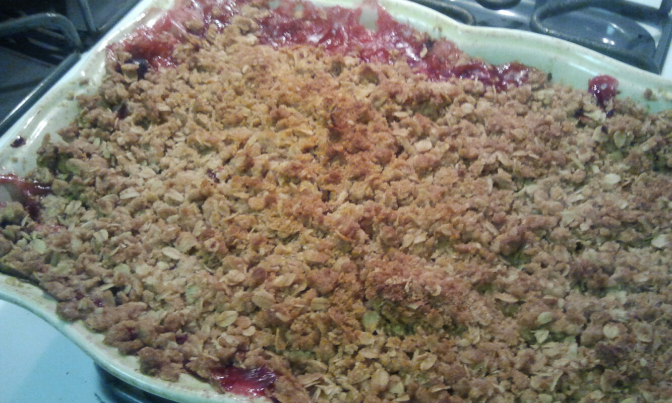 Bake 50-60 minutes or until the fruit is bubbly and the crumb topping has darkened.