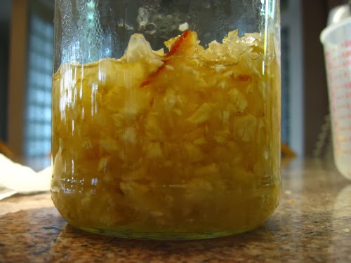 Next, the esrog is cooked in a sugar solution. For each esrog use the following proportions.
