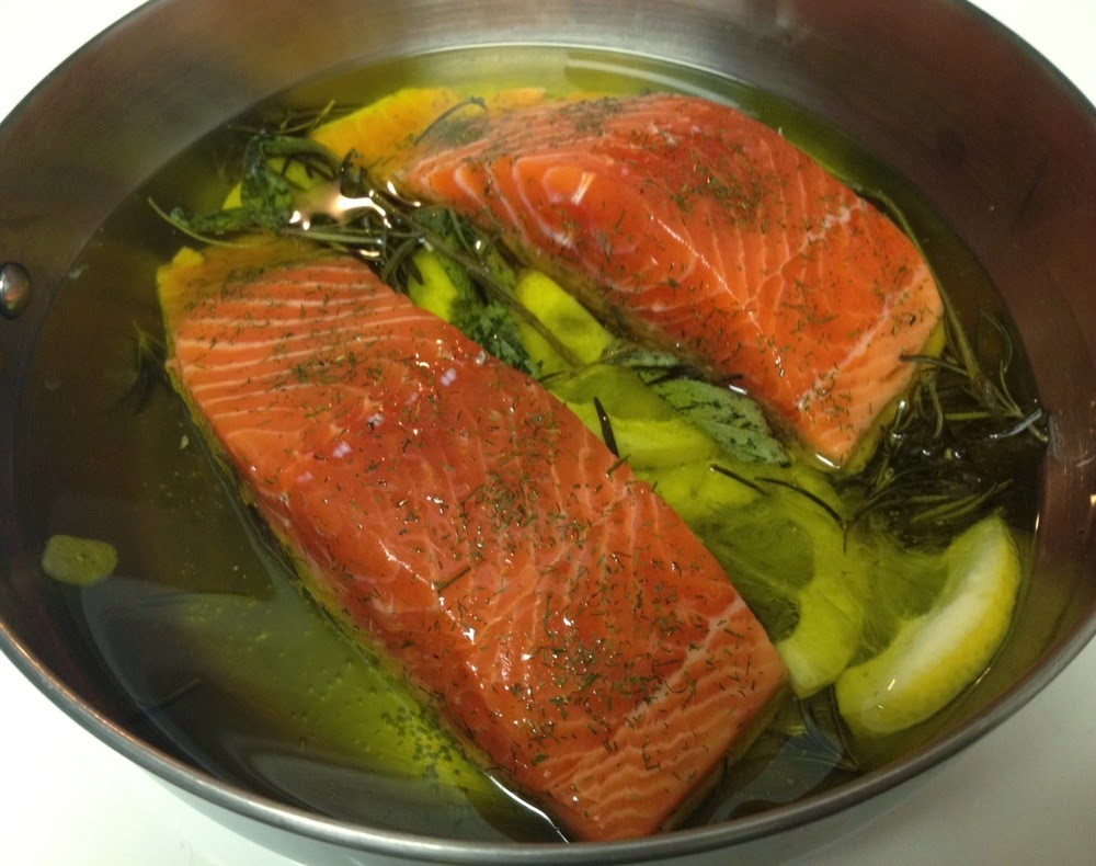fish in warm olive oil and then cooking it in the oven at a low temperature to