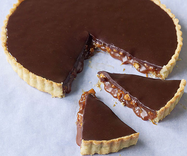 If you make this tart in advance, prepare crust and caramel layer and freeze. Prepare chocolate filling and freeze separately. Before baking, allow crust and filling to thaw completely. Continue as directed above.