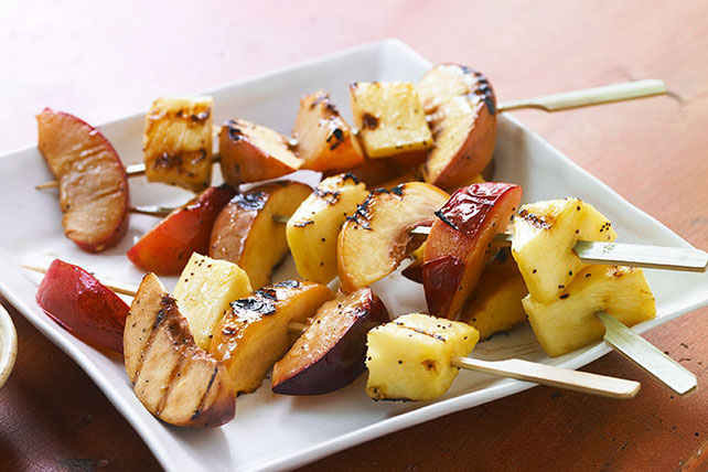 Thread the fruit on the soaked skewers, alternating each fruit type. Heat the grill to medium-high, making sure the grates are clean.