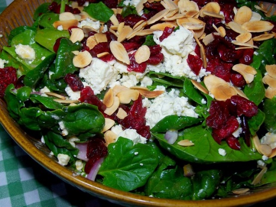 Tear spinach into bite size pieces and place in a serving bowl. Add half of the feta or goat cheese and onion; toss to combine.