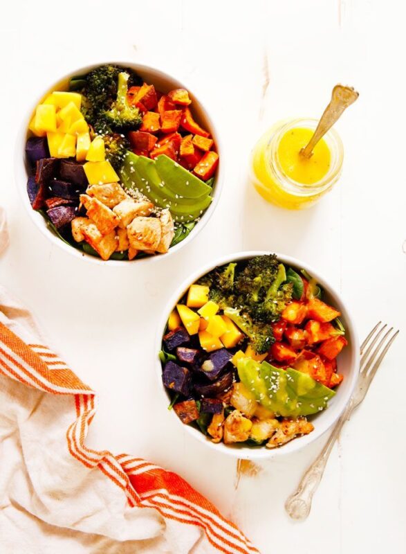Arrange roasted potatoes, broccoli, avocado, chicken, and