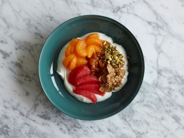 center. Arrange the grapefruit, mandarin oranges, cereal and pistachios in neat