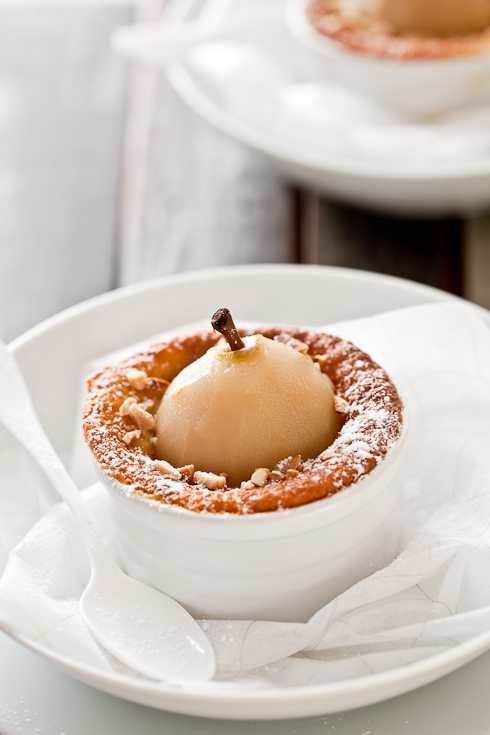 1/2 cup per ramekin), then gently nestle a pear in the center, pressing it very