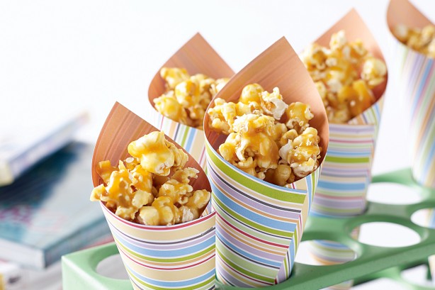Preheat oven to 250 degrees F. Spread popped popcorn and nuts in a large shallow pan and place in preheated oven.