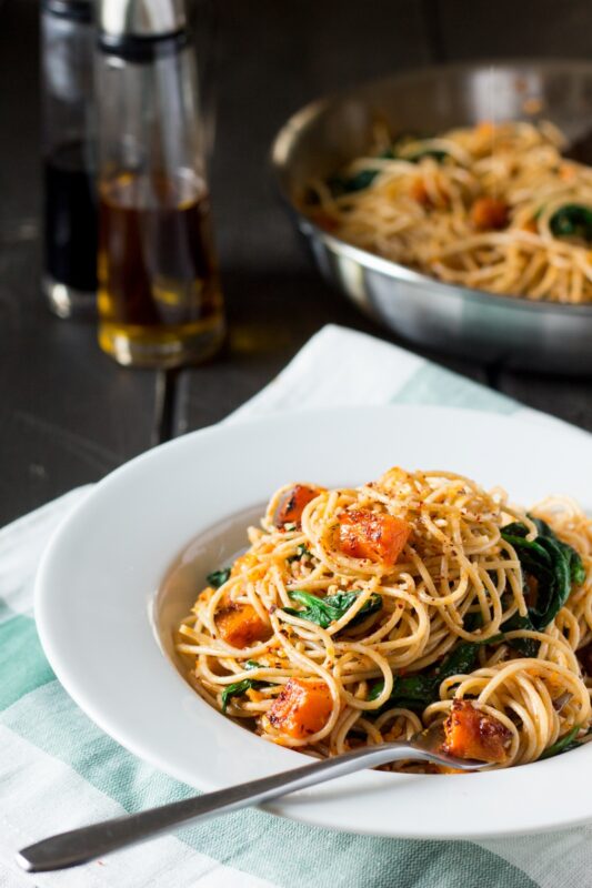 flakes and garlic. Add drained pasta to the pan. Add spinach to the pan, breaking up pieces if