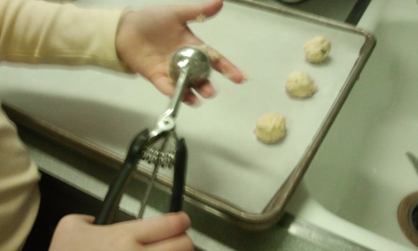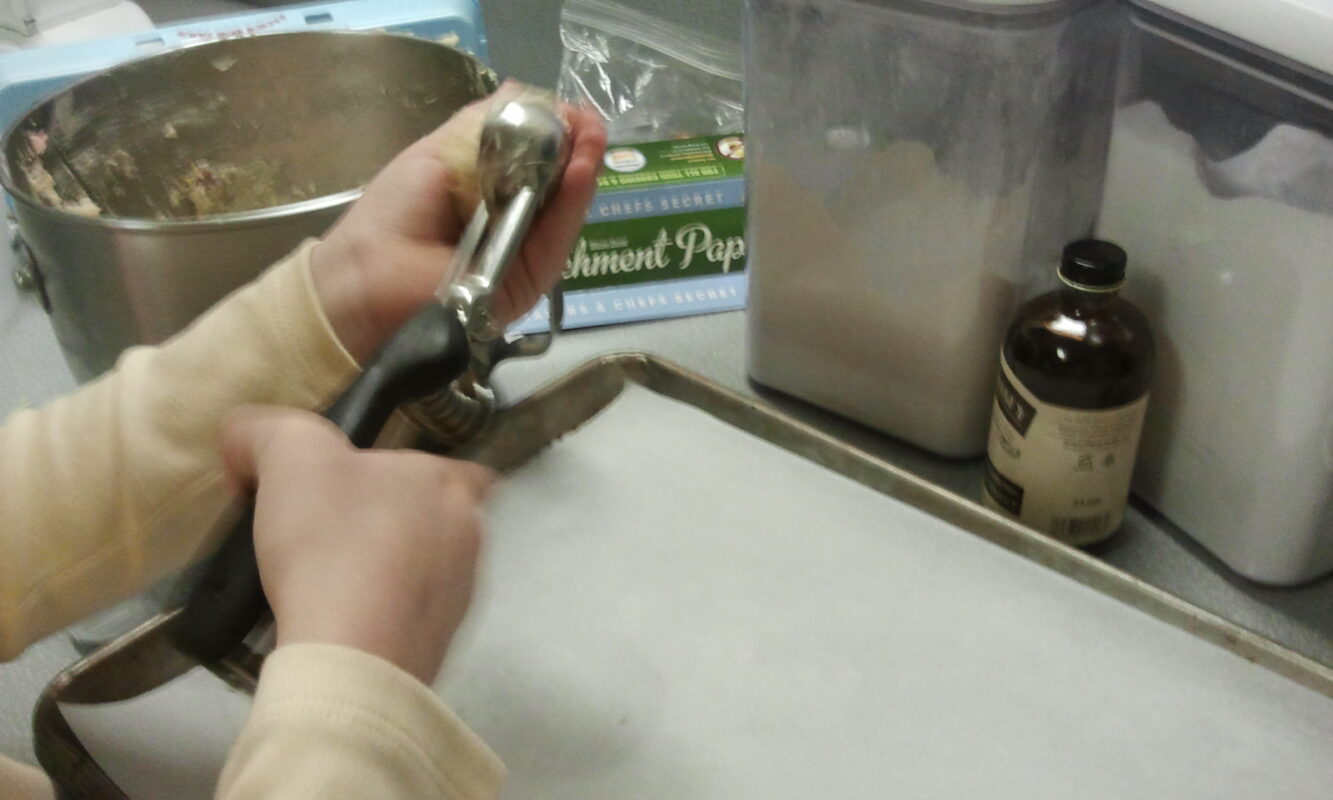 Scoop dough using a medium-sized cookie scoop. While you will be able to scoop the dough and scrape it directly onto the lined pan, kids may need to use both hands to ease the dough out of the scoop onto the pan. You can see my daughter using the scoop here—she had no difficulties once she figured out that it’s ok to use two hands. The biggest problem was keeping her from eating all the raw cookie dough!