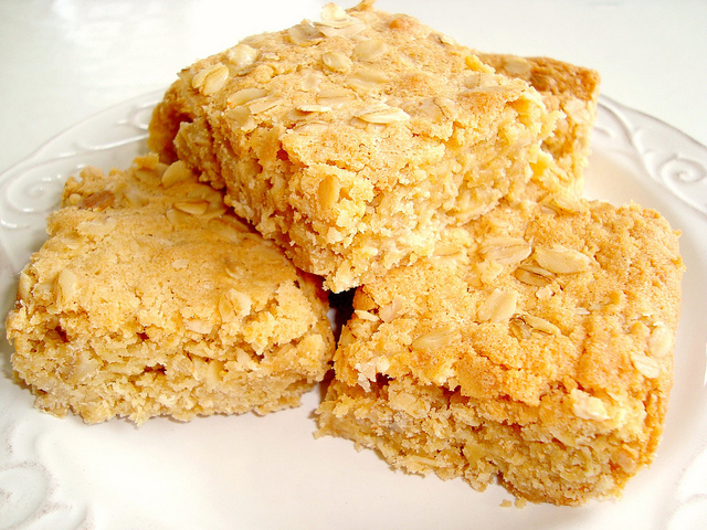 Grasp overhanging paper, transfer blondies (still on paper) to a wire rack to cool completely. Place on a cutting board (peel off paper); using a serrated knife, cut into 16 small squares.