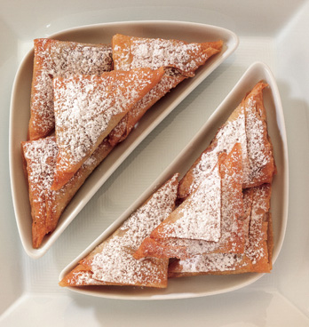 Using a sharp paring knife or pastry wheel, cut sheet into 4 strips lengthwise. Place a heaping tablespoon of filling at the top of one strip, about 1 inch away from the edge. Bring the short edge of the strip diagonally over the filling so it meets the long edge of the strip. Fold the triangle down, keeping the edges of the strip neatly aligned. Continue folding the triangle sideways and down along the entire length of the strip. Place the finished triangle on prepared pan. Repeat with remaining strips. Then repeat with remaining phyllo sheets until all 16 sheets have been used. Brush triangles with any remaining oil and sugar mixture.