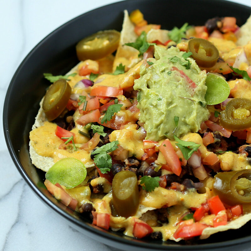 To build the nachos, place a layer of tortilla chips in an oven-to-tableware dish. Top with a layer of the beef mixture, then add another layer of chips, continue layering the chips and beef. Sprinkle some non-dairy cheese in between the layers if you are using it. Heat the broiler and place the dish in to broil for a few minutes to melt to “cheese”.