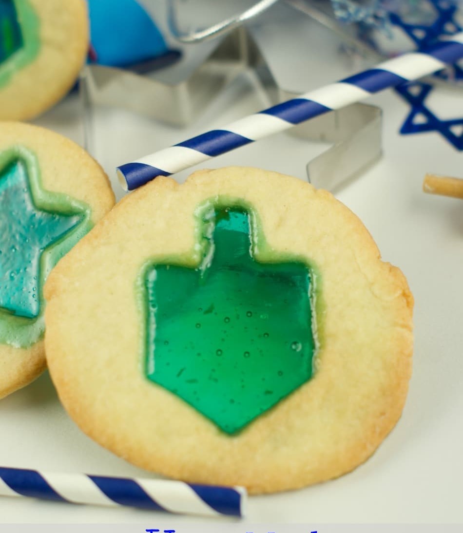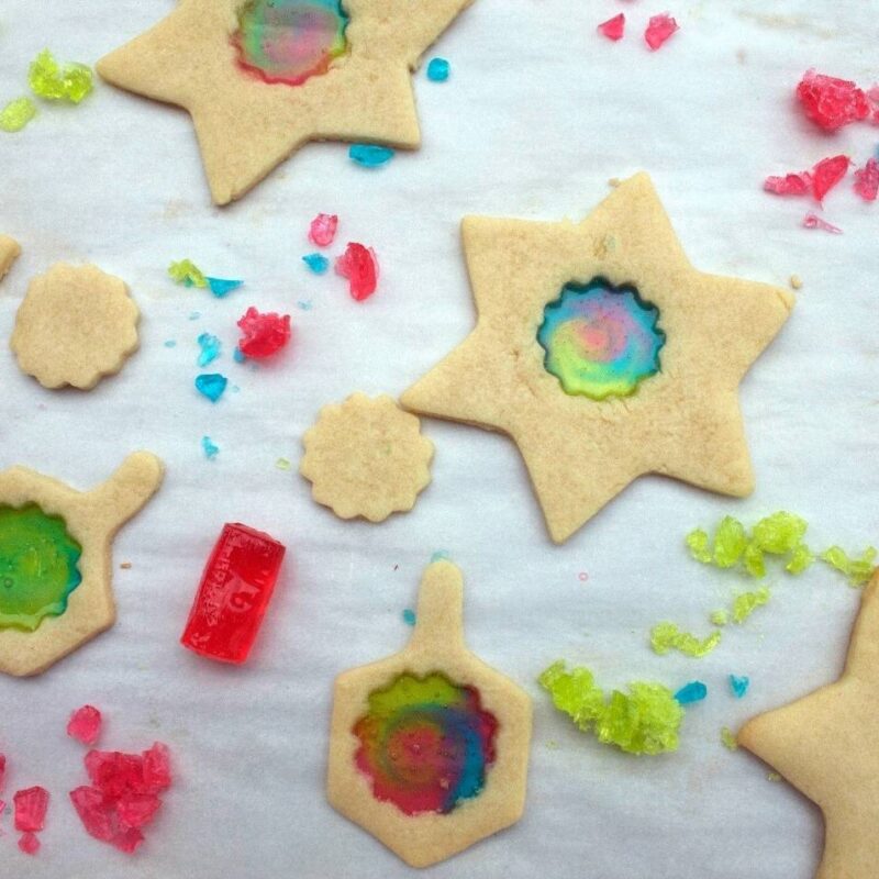 Word gets around in my daughter’s school. They know who to assign when the job calls for some extra creativity–which is why I found myself in the kitchen with my daughter and her friends, baking cookies for one of their pre-Chanukah events. They chose to make “stained glass cookies” cut into dreidels. These attractive edibles use a bit of ingenuity to bring basic sugar cookies up a notch.