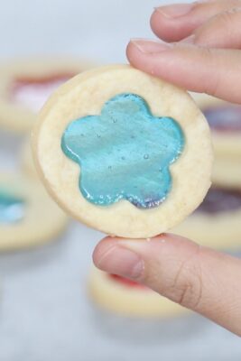 Unwrap sour ball candies or any hard candy of your choice and put in the middle of the dreidel. Place the sheet pan in the oven and bake for 12 minutes. The candy will melt and fill the dreidel cut out.When the edges of the cookies are golden, remove from oven. Place pan on a cooling rack. Let cool until the candy hardens. Don’t move while the candy is still soft.