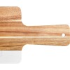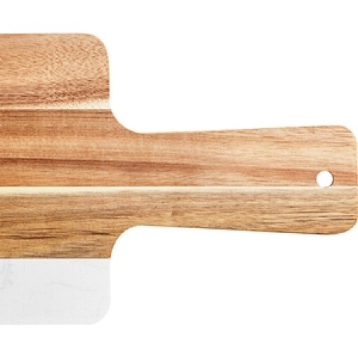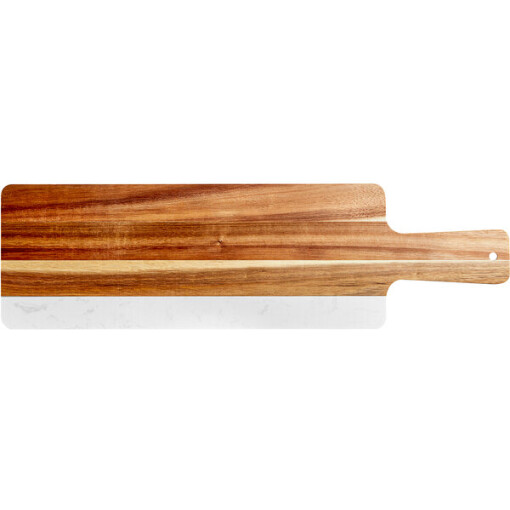Featuring an exotic acacia wood and sleek white marble construction, this board has a distinctive grain and is guaranteed to be one-of-a-kind. Plus, the acacia portion of this board comes pre-seasoned with food-grade mineral oil to help prevent it from becoming dry, brittle, and eventually cracking. With an adequate 23 1/2″ length (including the handle) and 7″ width, this serving board is ideal for serving a variety of foods, including charcuterie, hors d’oeuvres, flatbreads, and desserts. The 6″ handle is sturdy and long enough to allow for a secure grip while carrying the serving board to its destination at a table or catering or buffet display and features a convenient hanging hole for out-of-the-way storage.