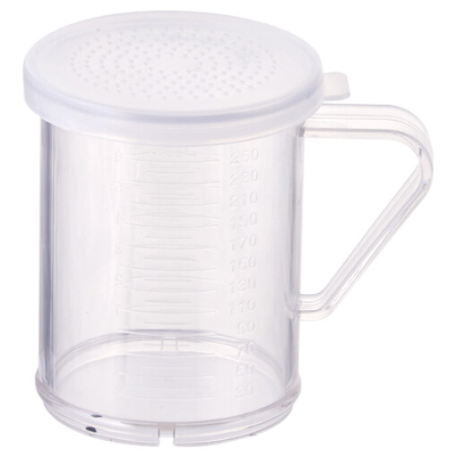The shaker set has a polycarbonate base and three snap-on covers in various sizes. The dredger is clear to make it easy to see what’s inside, and has a built-in handle for easy carrying. Small, medium, and large holes are featured in the three lids, making them ideal for any spice or condiment. Perfect for sprinkling flour on your work surface for rolling pastry dough. NSF-listed.