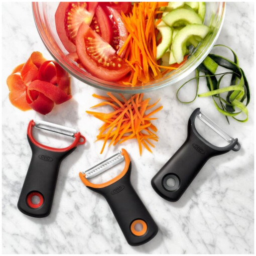The OXO Good Grips 3-Piece Assorted Prep Peeler Set includes straight, serrated and julienne Peelers so you’ll be ready for any peeling task. From a mountain of potatoes at Thanksgiving to your family slaw recipe to prepping peaches for a pot-luck pie, this set has you covered. Inspired by our iconic peelers, but with a new compact design and easy-to-maneuver shape, these will be your new go-to tools. The sharp, Japanese stainless steel blades will never rust, and the non-slip handle will keep you going until the job is done. Dishwasher safe.