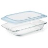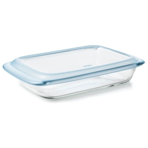 OXO Glass Bakeware is made of thermal shock resistant borosilicate glass, which means it can go from freezer to oven without the need to thaw. This Baking Dish has wide, comfortable handles which make it easy to transport from oven to countertop or table, and the slosh-proof lid makes it easy to prepare meals in advance, store leftovers, or take on the go.