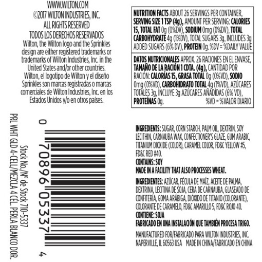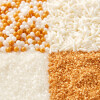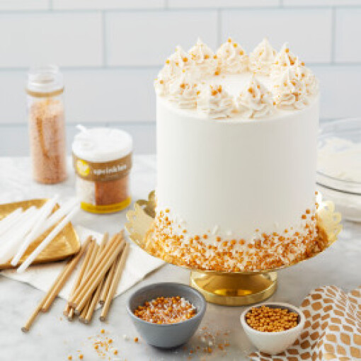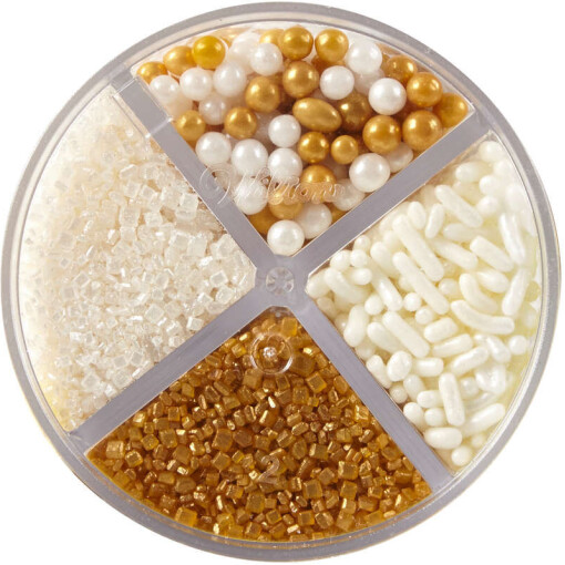 Top cakes, cookies, cupcakes and other treats with this 4-Cell Pearlized Gold Sprinkles Mix. Great for weddings, bridal and baby showers, Christmas, birthdays and more, this sprinkles mix is a fun way to add pearlized color and texture to your desserts. This mix of sprinkles contains white and gold sugar pearls; pearlized white jimmies; sparkling gold sanding sugar sprinkles; and sparkling white sanding sugar sprinkles. Each variety of sprinkle is packaged individually with its own lid, so you can use them one at a time or mix and match sprinkles for a fun look. Try them on some New Year’s Eve cupcakes or use them to decorate cookies for a bridal shower. Simple and elegant, this mix of pearlized gold and white sprinkles is great for adding color and texture to your treats.
