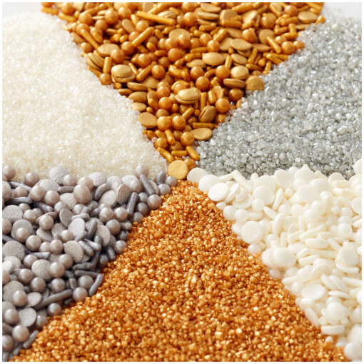 Top cakes, cupcakes, cookies and more with this 6-Cell Metallic Sprinkles Mix with Turning Lid. Fun for weddings, birthdays or anniversary parties, this sprinkles mix contains six sprinkle medleys you can use individually or mix and match to suit your occasion! Choose from white sanding sugar; a gold confetti, jimmies and nonpareils mix; silver sanding sugar; a white confetti, jimmies and nonpareils mix; gold sanding sugar; and a silver confetti, jimmies and nonpareils mix. The turn-style lid allows you to use one sprinkle mix at a time and each mix contains its own tear-off tab to help sprinkles maintain their freshness. The sculpted bottle also gives you a better grip for topping your favorite treats with these fun metallic sprinkles!