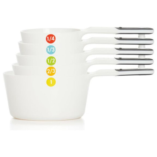 The 6 Piece Measuring Cups from Oxo snap together so you can take out only what you need, leaving the rest neatly together. Handles have soft, comfortable non-slip grips and permanent measurement markings. Color-coded, easy-to-read measurements on the side help you find the right sized cup faster.