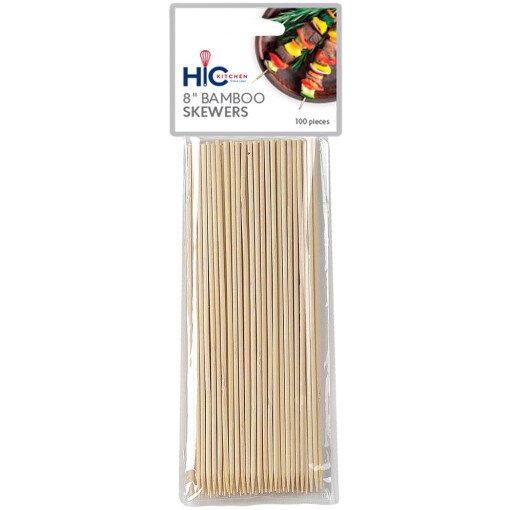 HIC’s Bamboo Skewers for preparing, cooking, and serving appetizers, entrees, desserts, craft cocktails, and more. Made from all-natural bamboo; strong, durable and eco-friendly; food safe, oven safe and flame safe when pre-soaked in water. Bamboo securely grips food and seals stuffed foods; pointed tip makes loading foods easier; won’t transfer heat to hands or scratch surfaces. Easy to use; simply pierce food with pointed end, slide food to the center, cook or serve; for grilling, roasting, broiling, baking, and more. Includes 100 bamboo skewers; easy to use; won’t melt like plastic skewers; disposable for easy cleanup.