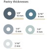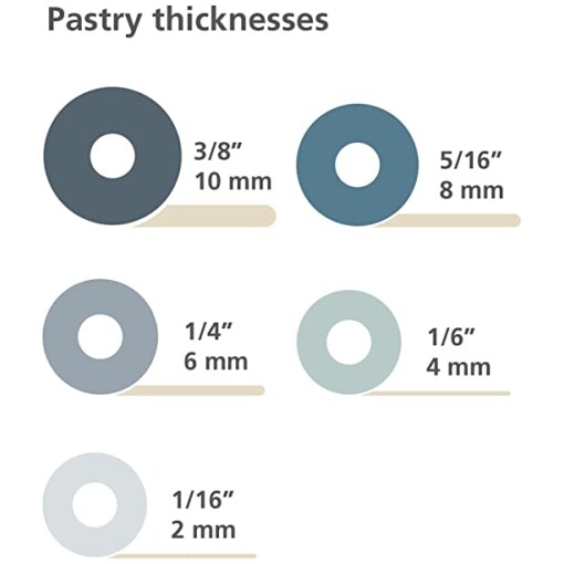 Rolls pastry thickness: 2mm (1/16”), 4mm (1/6”), 6mm (1/4”), 8mm (5/16”) or 10mm (3/8”) approximately
