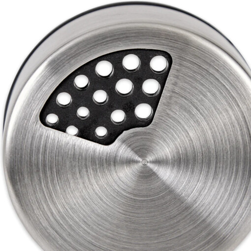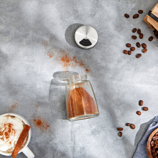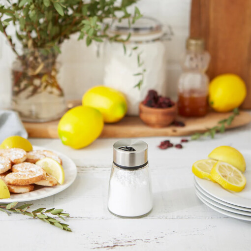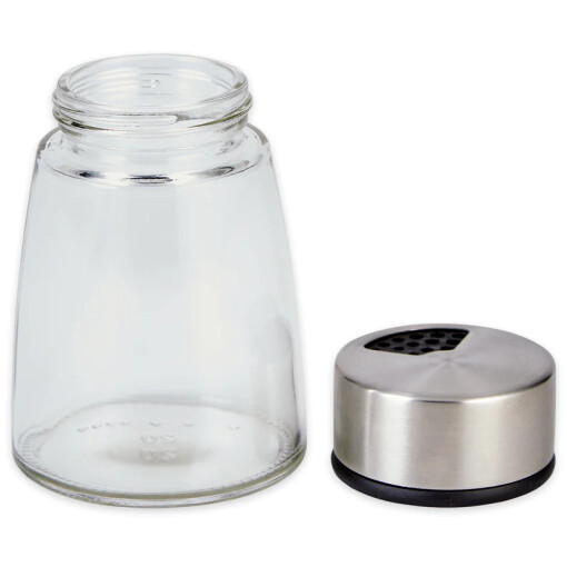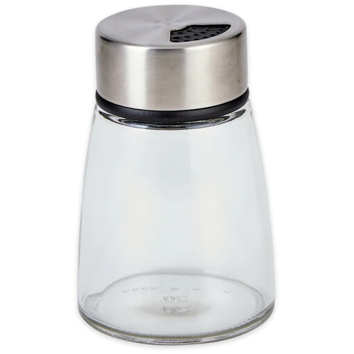 Dispense cocoa powder, powdered sugar, cinnamon, and other spices with this versatile, elegant glass dispenser. Rotate the lid for adjustable pour holes. Clear glass jar and stainless steel lid. Dishwasher safe.