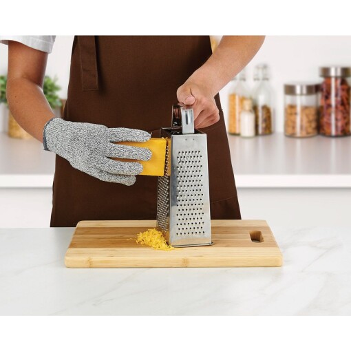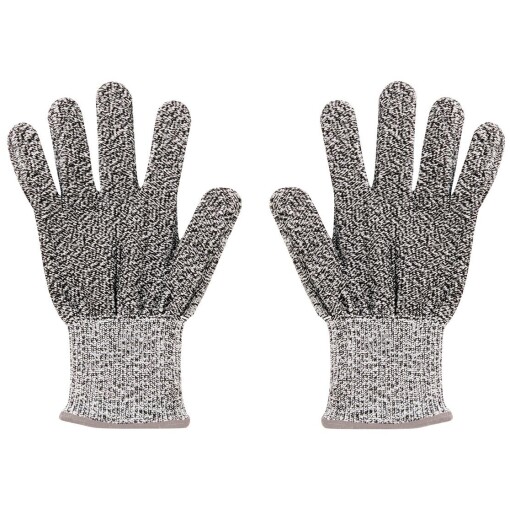 Cutlery Pro’s Mesh Cutting Gloves are specially designed to protect hands, fingers and wrists from scratches, cuts, and abrasions while working with sharp objects. Crafted from a ‘Level-5’ European LFGB food-safe certified fabric of HPPE (high-performance polyethylene), basalt fiber, and spandex, these lightweight gloves offer the highest level of safety and protection against the sharpest edges with optimal dexterity, full breathability, and comfort. Maneuver comfortably and confidently without removing the gloves. An invaluable addition to kitchen accessories and cooking tools, these ultimate safety gloves promote smart kitchen safety practices through a variety of uses. They’re perfect for safer food preparation when handling sharp and abrasive objects, like kitchen knives, mandolines, mezzaluna and ulu blades, vegetable and cheese graters, oyster shuckers and clam knives, and other sharp kitchen tools. They’re useful as protective gear around the house and yard, too. Stash a pair with other safety equipment in the workshop or garage for working on hobbies, maintaining the car or lawn mower, cutting and sanding projects, and for safely picking up broken glass. In colder weather, wear them under ordinary winter gloves for protective gear that also keep hands warm, dry, and free from cuts. Made from HPPE (high performance polyethylene), with nylon and spandex fabric, Cutlery Pro’s Mesh Cutting Gloves are European LFGB food-safe certified, breathable, comfortable, and fully flexible with certified level-5 protection. Does not protect against punctures. Hand wash and hang to dry.