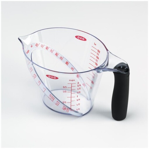 OXO has revolutionized liquid measuring with our Good Grips Angled Measuring Cups. A patented angled surface lets you read measurement markings by looking straight down into the Cup and eliminates the need to fill, check and adjust the amount of liquid yo