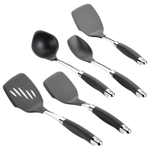 Set includes 12-inch mini solid turner, 13.25-inch slotted turner, 13.25-inch solid turner, 13.25-inch solid spoon, 13.25-inch ladle.