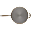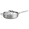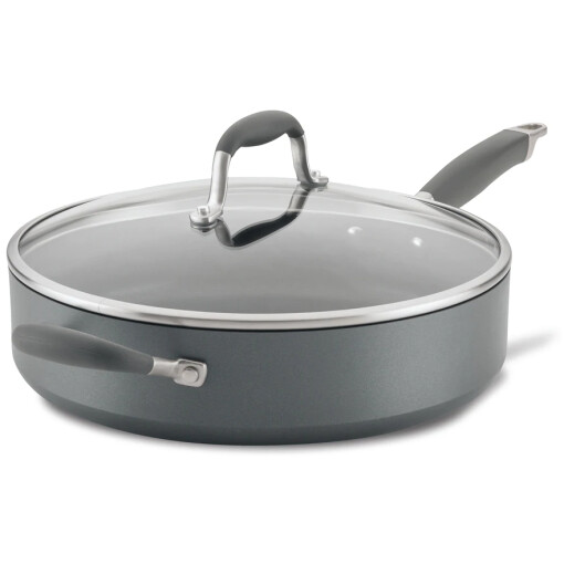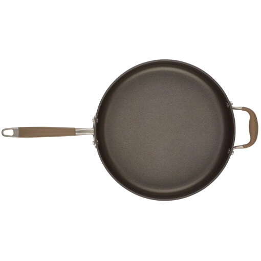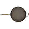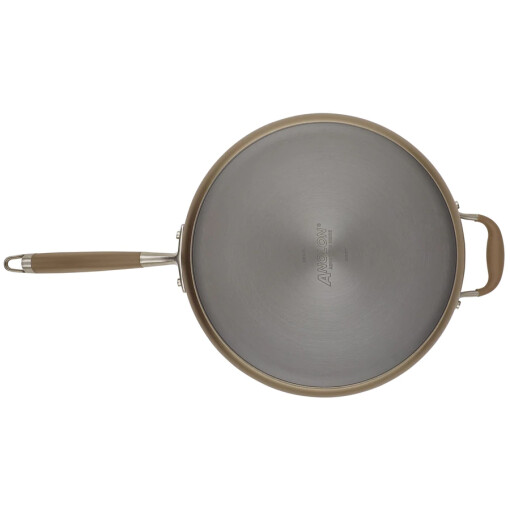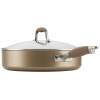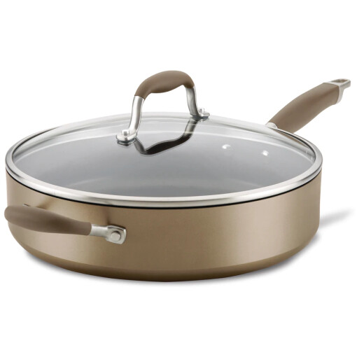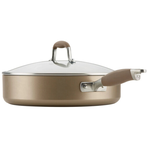 This generous sauté pan with helper handle packs in serious one-pan-meal versatility. Premium, metal-utensil-safe nonstick and tight-fitting glass lid for all of your favorite braises, stews, sauces and more. This sauté pan features the signature SureGrip handles for a comfortable, confident grip. Warm bronze-toned nonstick exterior with a touch of easy-clean elegance. Oven safe to 400°F.