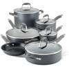Set includes: 1.5-quart saucepan with lid, 3-quart saucepan with lid, 8-quart stockpot with lid, 4-quart sauté with helper handle and lid, 8.5-inch frying pan, 12-inch deep frying pan with helper handle and lid