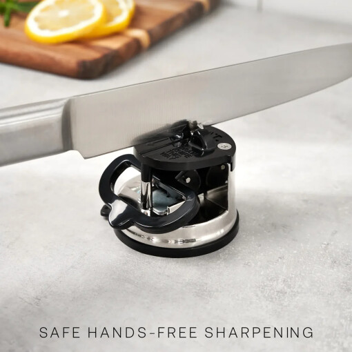 The PowerGrip suction base attaches securely to any smooth surface, keeping your hands safe while sharpening. Designed with a polymer guiding top, it protects your knife edges from damage, making it safe for you and your blades.