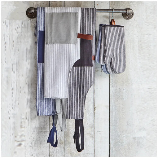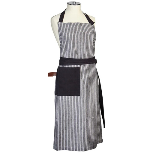 This apron has a classic pin stripe design, extra long waist straps and faux leather accents. A must-have for any cook. Machine washable.