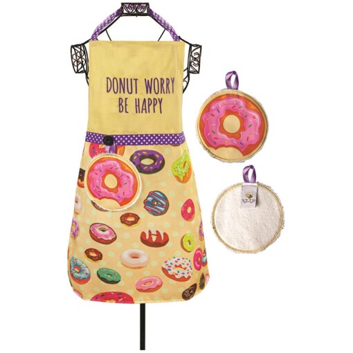 Dress your favorite mini-host in our Don’t Worry Be Happy Apron w/ Hand Towel Set at cooking time. Our 18″ x 25″ apron is a great gift for aspiring chefs! This durable kitchen accessory features adjustable straps and a waist tie. Sold with a coordinating hand towel that attaches to the waistband with a loop and button.