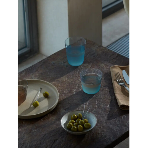 A set of two tumblers with rounded bases, softly tapered profiles, and a matte textured finish to the lower half. A versatile shape for water, lager and long cocktails. Made from soda-lime glass for clarity and strength, and designed for the everyday.