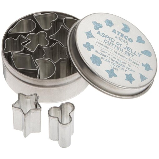 This set of Aspic/Jelly Cutters by Ateco, includes 12 fancy shaped cutters. These cutters are made of stainless steel and are perfect for cutting aspic, jelly, cakes, and more into fun shapes. Cutters are available in multiple sizes.