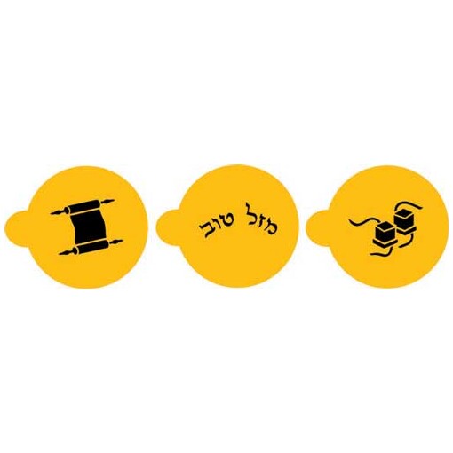 Perfect for creating Bar Mitzvah themed cookies. Each stencil fits a 2″ wide cookie. The set includes a TORAH – MAZEL TOV (In Hebrew) – TEFILLIN. These designs are made of durable 10 mil food grade plastic for high-quality, professional, repeat use.
