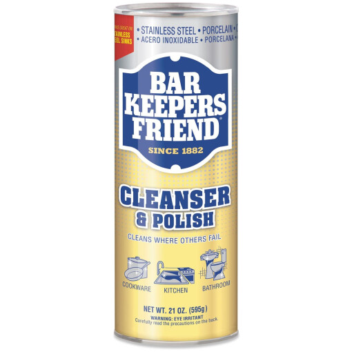This Barkeeper’s Friend cleanser and polish is a non abrasive powder which removes rust and hard water stains. It can be used for copper, tile, brass, stainless steel, porcelains, plastics, and glass cooktops. Great for removing grease from non stick cookware. 21 ounce can.