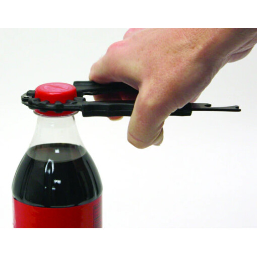 Multi-function opener requires little torque to open twist caps, bottle caps or ring tabs.