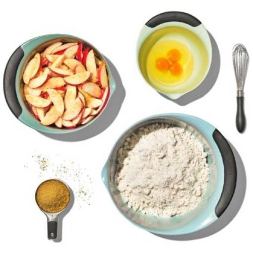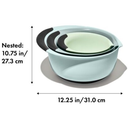The OXO Good Grips 3-Piece Mixing Bowl Set helps you tackle any culinary project, from whisking eggs to mixing cupcake batter to making marinade. These bowls feature soft, non-slip handles. Non-skid bottoms stabilize the Bowls on any kitchen surface, even at an angle. Wide lips and spouts make pouring ingredients easier than ever. Plus, the Mixing Bowls nest neatly for convenient storage. Dishwasher safe.