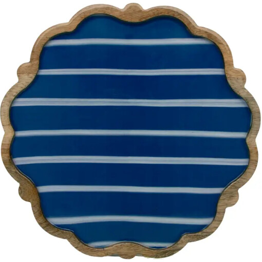 Crafted of mango wood, this Blue Wavy Edge Striped Platter pairs a scalloped silhouette with bold blue-and-white stripes to bring graphic charm to any tabletop. The natural wood rim warms the color and pattern, making it a striking, versatile piece for passing appetizers or anchoring a casual centerpiece.