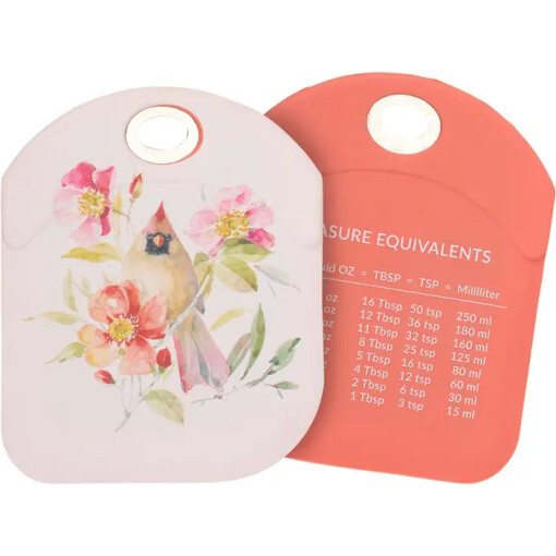 A double-sided silicone bowl scraper from our Botanical Collection displaying a charming scene of a cardinal with colorful summer flowers. Everyday cardinal design is replicated from original art hand painted in a delicate watercolor style. Our Everyday Cardinal bowl scraper features a sturdy stainless steel handle and convenient measurement equivalents on the back for easier baking. Silicone bowl scraper is hand wash only. A cardinal themed kitchen accessory great for gifting.