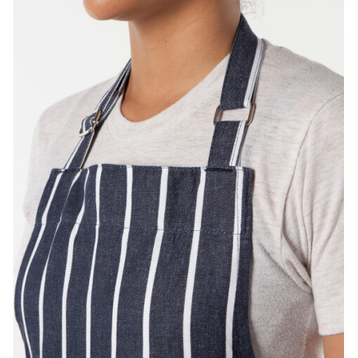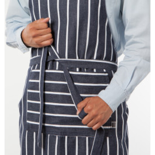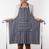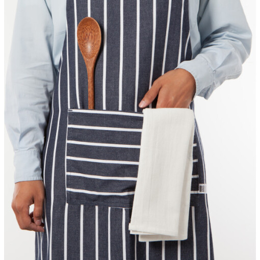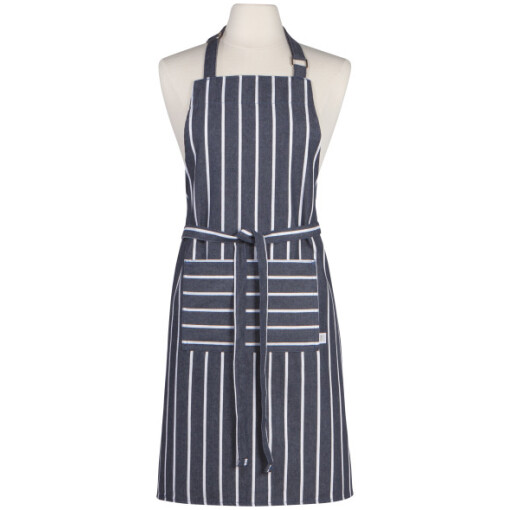 Chef Apron: Classic navy blue butcher stripe is simple and practical. Features a large front pocket to hold cooking essentials like recipe cards, and more. This chef’s apron is designed to fit men and women: it has long ties that can tie at the front and features an adjustable neck strap for a comfortable fit. Stress points throughout the apron have been bar-tacked for extra durability and to resist wear and tear. Easy care: machine wash and dry. Heavy-weight yarn dyed stripes, plaids or printed twill fabrics that hold up in the most demanding kitchens.