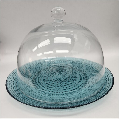 The beautiful glass cake dome with a blue Jupiter base is absolutely stunning. The combination of the clear glass dome and the vibrant blue base creates a striking visual impact. The elegant design and unique color choice make it a standout piece for displaying and serving cakes.