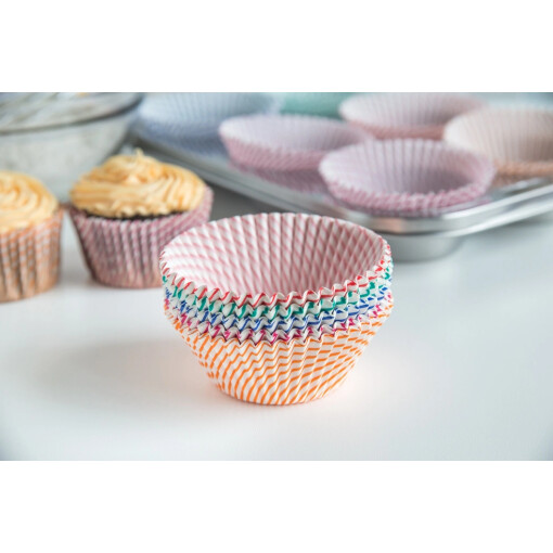 Time to get festive! This set of multi-color candy cane swirl bake cups are sure to take your cupcakes up a notch. This set includes 100 standard size food-safe, fluted paper baking cups, so you can bake and serve tons of cupcakes for your guests. Simply place in a muffin tin and fill with your favorite batter to dress up your cupcakes. Perfect for the holidays!